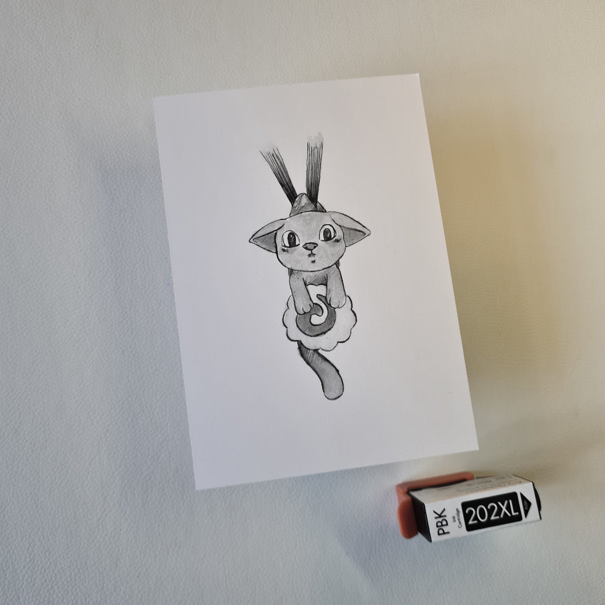 Ein Hauch von Leichtigkeit und eine Portion Überraschung. Eine kleine Katze, die mit Essstäbchen kunstvoll emporgehoben wird, hält überrascht ein Narutomaki in ihren Pfoten, als wäre sie gerade in eine völlig unerwartete Situation geraten. Diese niedliche Zeichnung verbindet asiatische Esskultur mit tierischer Verspieltheit